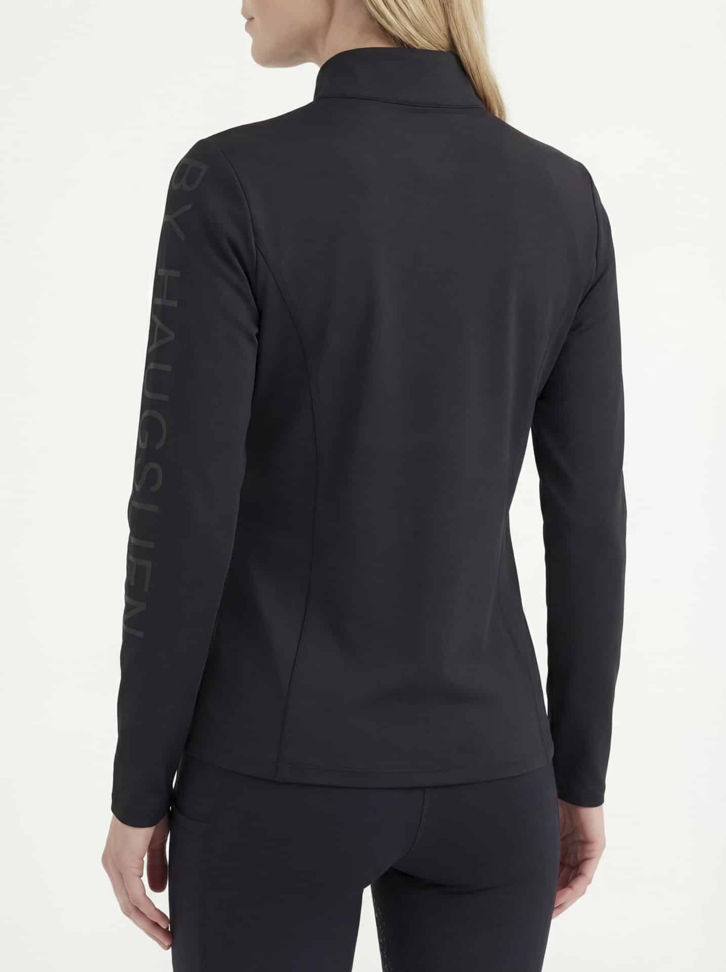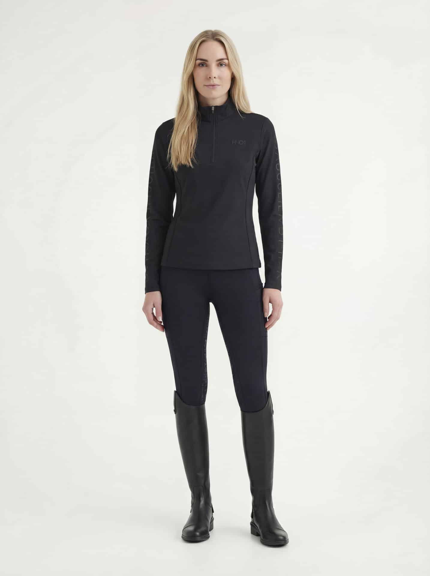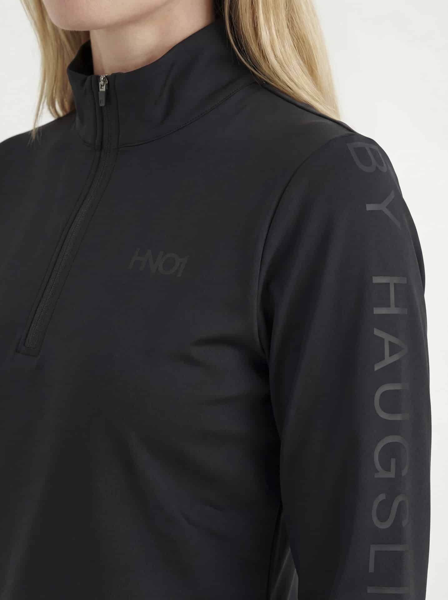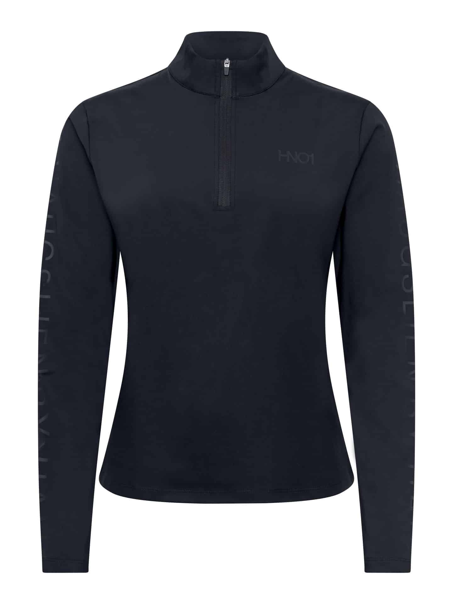 Black long sleeved zip-up shirt with HNO1 logo in the front and logo writing down the sleeves. It has four-way stretch, which makes it very comfortable during both training and stable work. Practical half-zip with turtleneck. The jersey is both breathable and heat regulating.